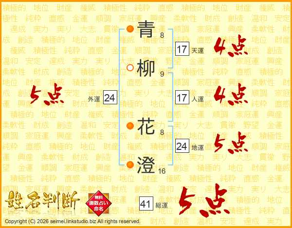 青(8画)柳(9画) 花(8画)澄(16画)