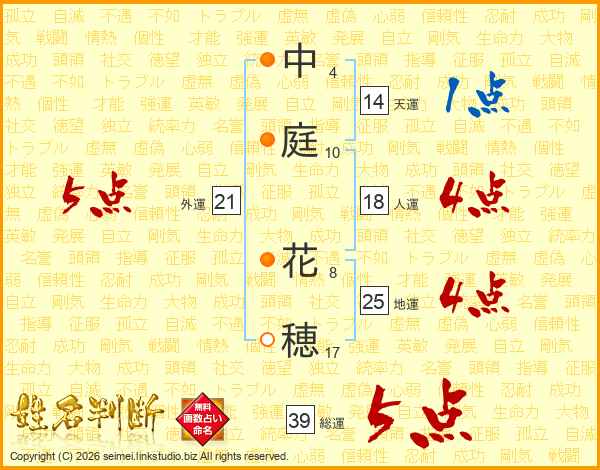 生活面を象徴する運勢です。外部から受ける影響力を表し、結婚運、家庭運や職場、環境への順応性を表します。総運から人運を引いた画数。姓や名が1文字の場合を除く。