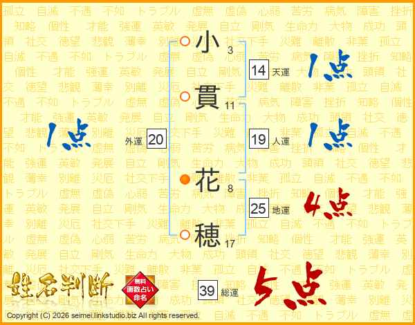 小貫花穂さんの総運は39画の5点!