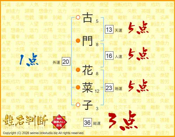 古(5画)門(8画) 花(8画)菜(12画)子(3画)
