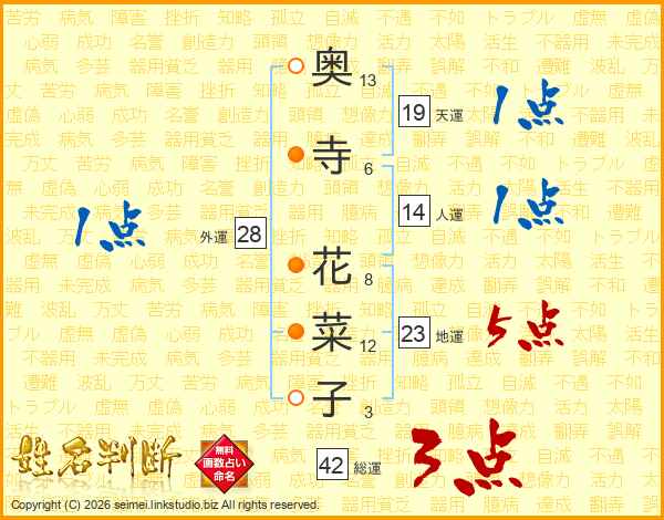奥(13画)寺(6画) 花(8画)菜(12画)子(3画)