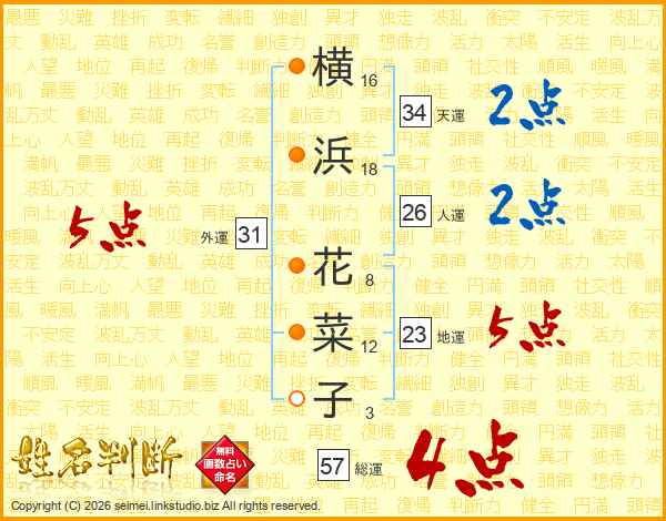 横(16画)浜(18画) 花(8画)菜(12画)子(3画)