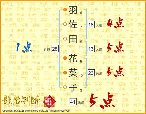 羽(6画)佐(7画)田(5画) 花(8画)菜(12画)子(3画)