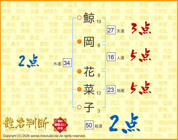 鯨(19画)岡(8画) 花(8画)菜(12画)子(3画)