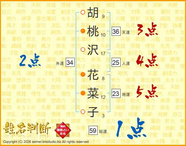 胡(9画)桃(10画)沢(17画) 花(8画)菜(12画)子(3画)