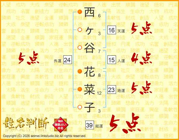 西ヶ谷花菜子さんの総運は39画の5点!