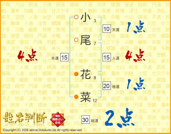 生活面を象徴する運勢です。外部から受ける影響力を表し、結婚運、家庭運や職場、環境への順応性を表します。総運から人運を引いた画数。姓や名が1文字の場合を除く。