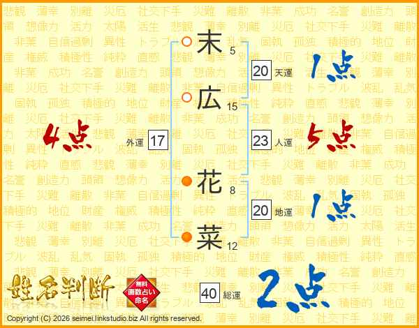 生活面を象徴する運勢です。外部から受ける影響力を表し、結婚運、家庭運や職場、環境への順応性を表します。総運から人運を引いた画数。姓や名が1文字の場合を除く。
