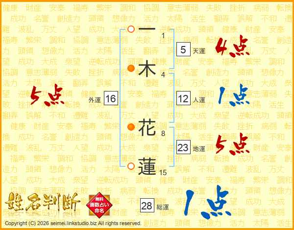 生活面を象徴する運勢です。外部から受ける影響力を表し、結婚運、家庭運や職場、環境への順応性を表します。総運から人運を引いた画数。姓や名が1文字の場合を除く。