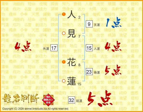 生活面を象徴する運勢です。外部から受ける影響力を表し、結婚運、家庭運や職場、環境への順応性を表します。総運から人運を引いた画数。姓や名が1文字の場合を除く。