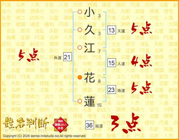 小(3画)久(3画)江(7画) 花(8画)蓮(15画)
