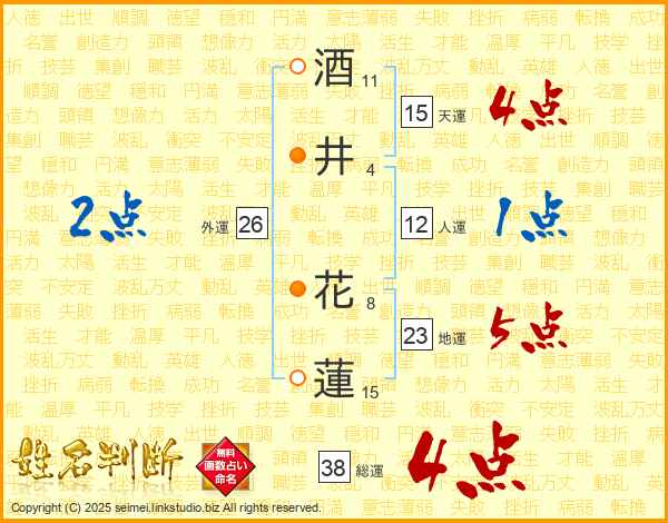 酒(11画)井(4画) 花(8画)蓮(15画)
