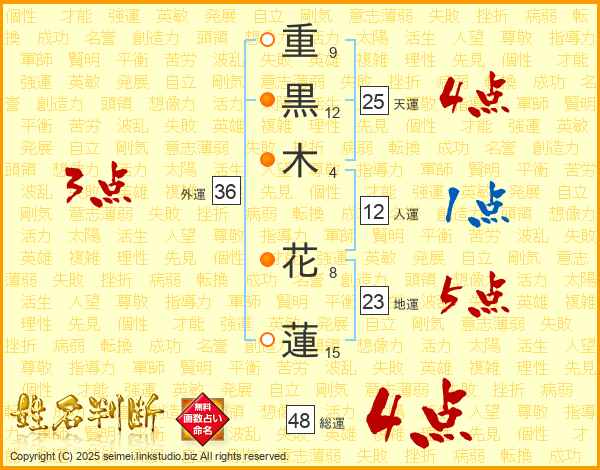 重(9画)黒(12画)木(4画) 花(8画)蓮(15画)