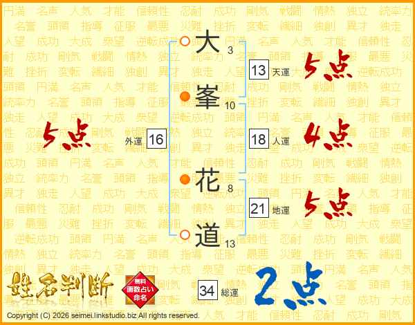 あなたの人生を表す1番重要な運勢です。生涯を通じて影響する総合運となり、主に50歳以降の晩年期に影響を及ぼします。苗字と名前の合計画数。