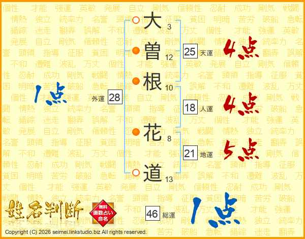 大(3画)曽(12画)根(10画) 花(8画)道(13画)