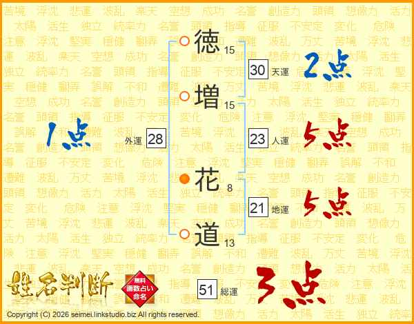 徳(15画)増(15画) 花(8画)道(13画)