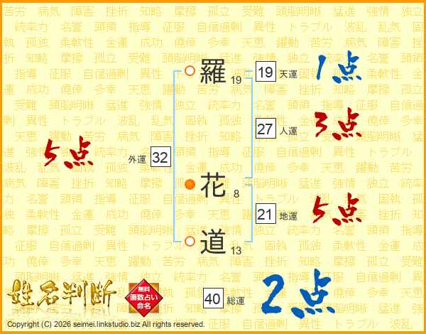 生活面を象徴する運勢です。外部から受ける影響力を表し、結婚運、家庭運や職場、環境への順応性を表します。総運から人運を引いた画数。姓や名が1文字の場合を除く。