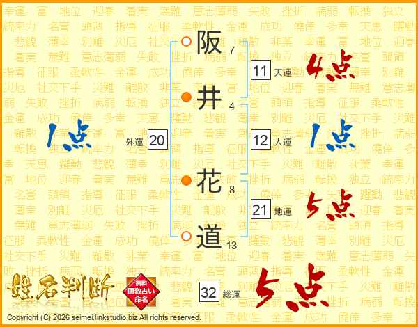 生活面を象徴する運勢です。外部から受ける影響力を表し、結婚運、家庭運や職場、環境への順応性を表します。総運から人運を引いた画数。姓や名が1文字の場合を除く。