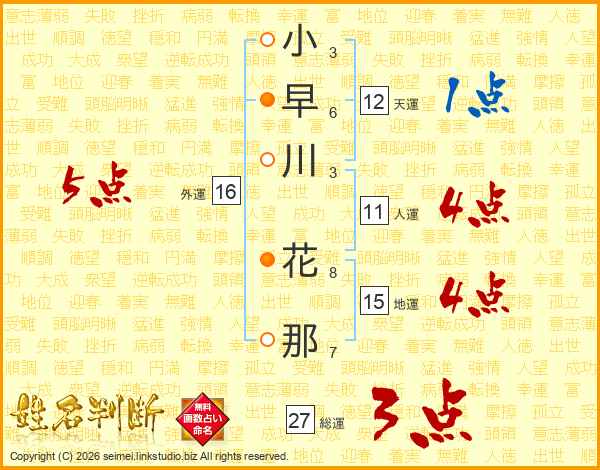 小(3画)早(6画)川(3画) 花(8画)那(7画)