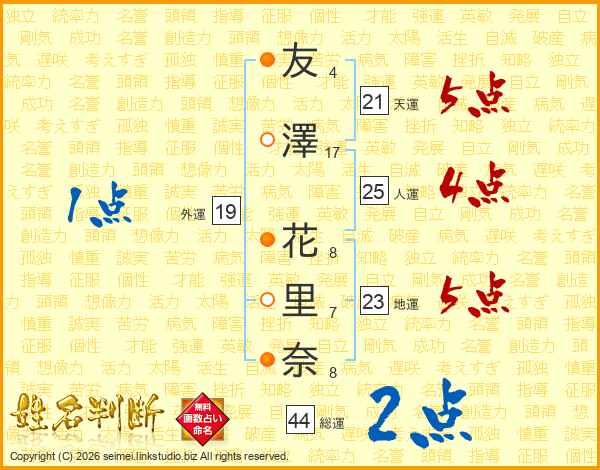 友(4画)澤(17画) 花(8画)里(7画)奈(8画)
