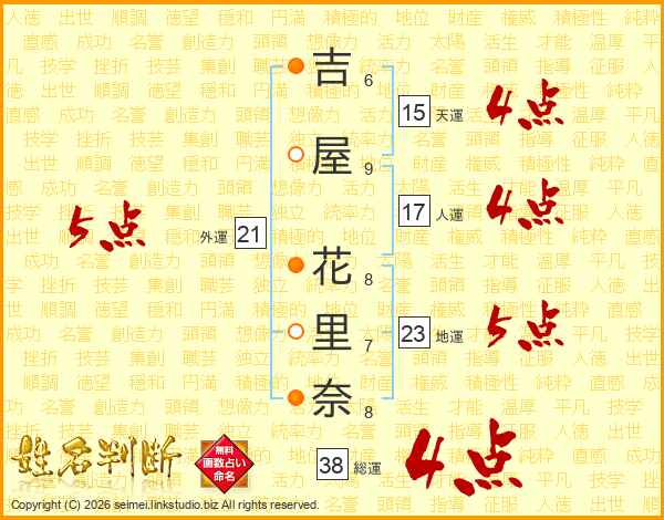 吉(6画)屋(9画) 花(8画)里(7画)奈(8画)