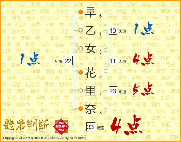 早(6画)乙(1画)女(3画) 花(8画)里(7画)奈(8画)