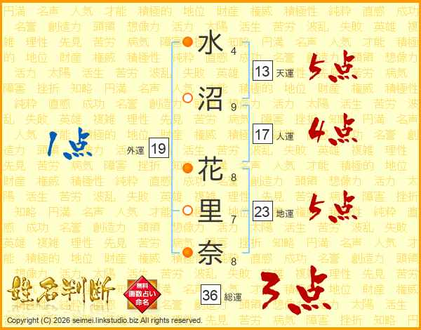 水(4画)沼(9画) 花(8画)里(7画)奈(8画)