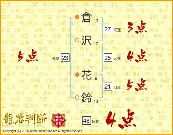 倉(10画)沢(17画) 花(8画)鈴(13画)