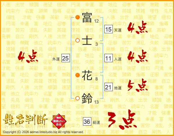 富(12画)士(3画) 花(8画)鈴(13画)