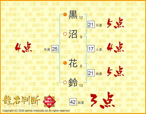 黒(12画)沼(9画) 花(8画)鈴(13画)