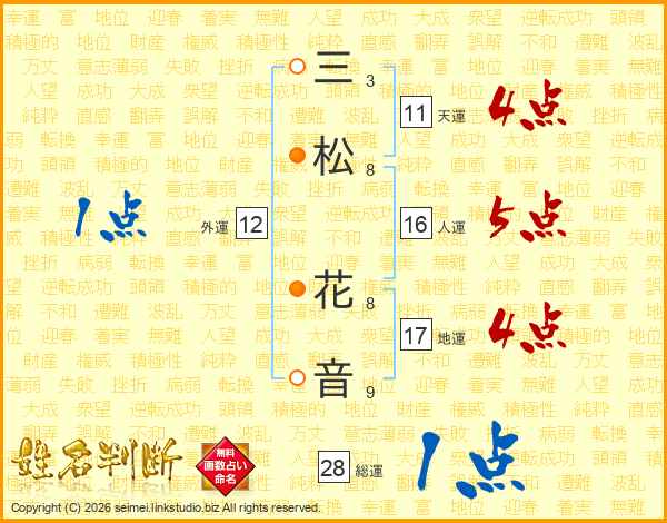 生活面を象徴する運勢です。外部から受ける影響力を表し、結婚運、家庭運や職場、環境への順応性を表します。総運から人運を引いた画数。姓や名が1文字の場合を除く。