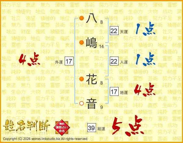 八(8画)嶋(14画) 花(8画)音(9画)
