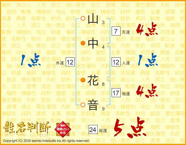 あなたの人生を表す1番重要な運勢です。生涯を通じて影響する総合運となり、主に50歳以降の晩年期に影響を及ぼします。苗字と名前の合計画数。