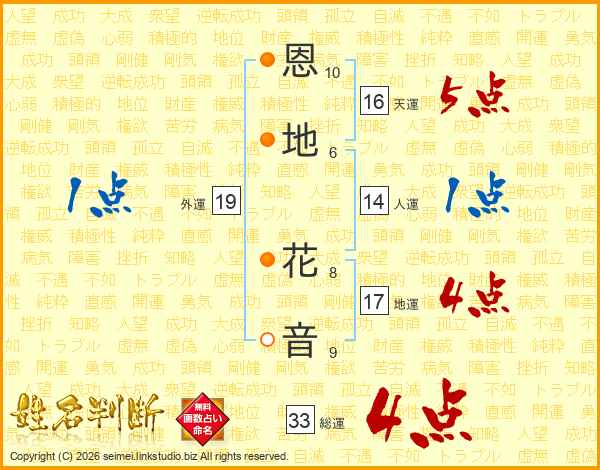 生活面を象徴する運勢です。外部から受ける影響力を表し、結婚運、家庭運や職場、環境への順応性を表します。総運から人運を引いた画数。姓や名が1文字の場合を除く。