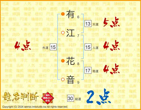 生活面を象徴する運勢です。外部から受ける影響力を表し、結婚運、家庭運や職場、環境への順応性を表します。総運から人運を引いた画数。姓や名が1文字の場合を除く。