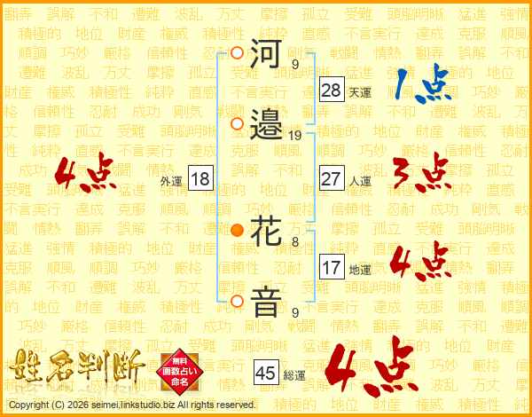生活面を象徴する運勢です。外部から受ける影響力を表し、結婚運、家庭運や職場、環境への順応性を表します。総運から人運を引いた画数。姓や名が1文字の場合を除く。