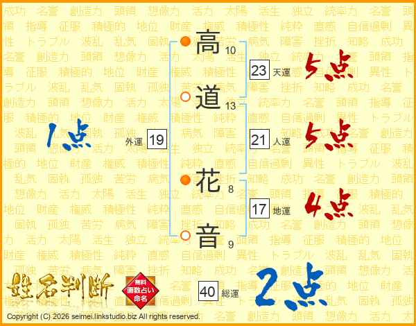 高(10画)道(13画) 花(8画)音(9画)
