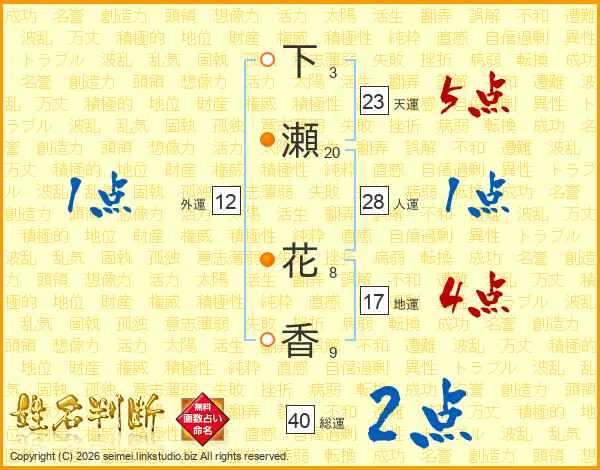 下(3画)瀬(20画) 花(8画)香(9画)