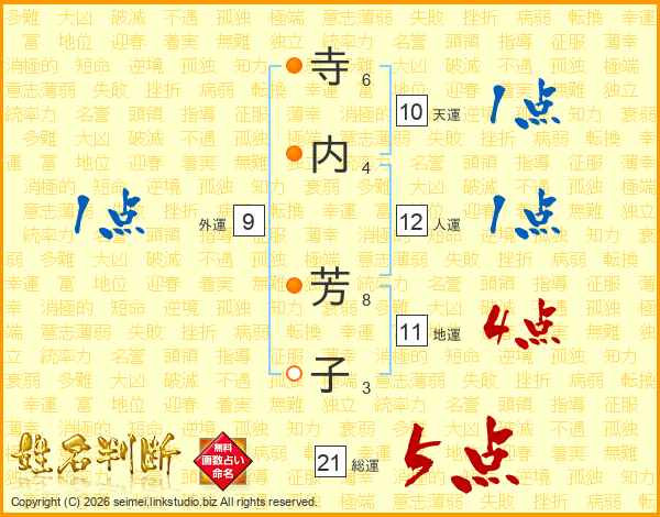 寺(6画)内(4画) 芳(8画)子(3画)