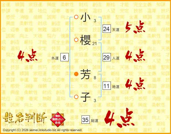 小(3画)櫻(21画) 芳(8画)子(3画)
