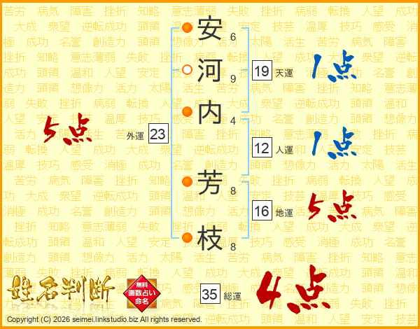 安(6画)河(9画)内(4画) 芳(8画)枝(8画)