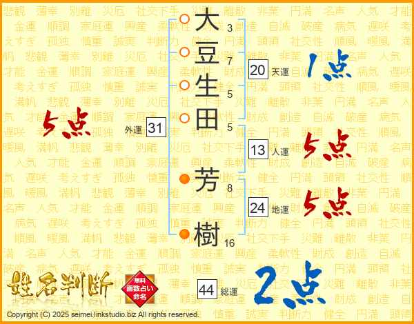 大豆生田芳樹さんの総運は44画の2点!