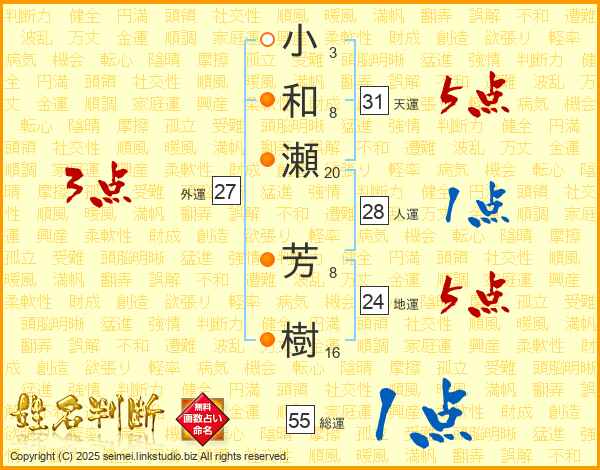 小(3画)和(8画)瀬(20画) 芳(8画)樹(16画)