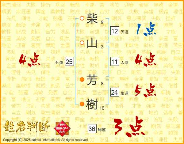 柴(9画)山(3画) 芳(8画)樹(16画)