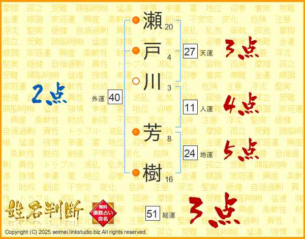 瀬(20画)戸(4画)川(3画) 芳(8画)樹(16画)