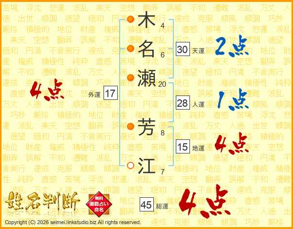 木(4画)名(6画)瀬(20画) 芳(8画)江(7画)
