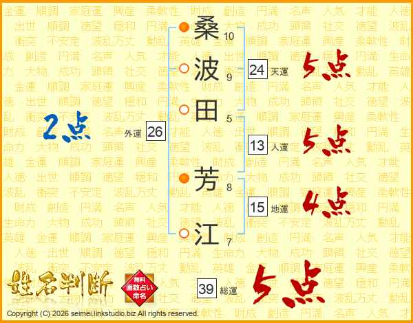 桑(10画)波(9画)田(5画) 芳(8画)江(7画)