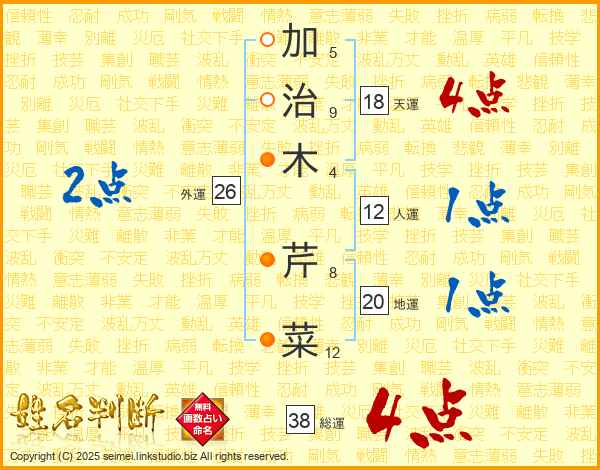 生活面を象徴する運勢です。外部から受ける影響力を表し、結婚運、家庭運や職場、環境への順応性を表します。総運から人運を引いた画数。姓や名が1文字の場合を除く。