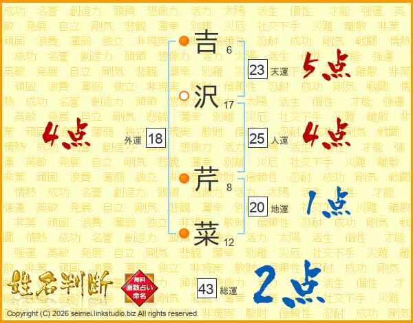 吉(6画)沢(17画) 芹(8画)菜(12画)