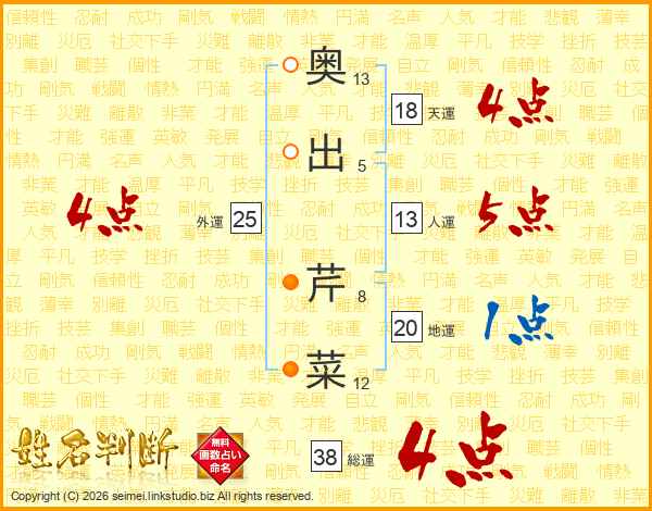 生活面を象徴する運勢です。外部から受ける影響力を表し、結婚運、家庭運や職場、環境への順応性を表します。総運から人運を引いた画数。姓や名が1文字の場合を除く。